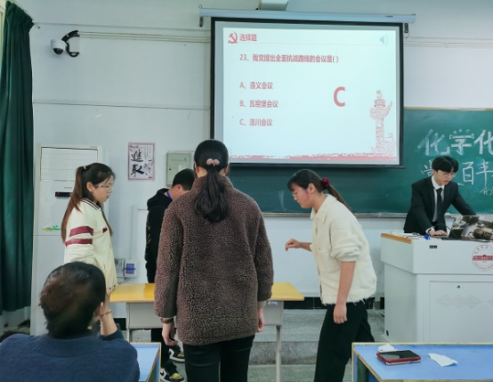 “1935年12月9日,在中国共产党领导下,在哪里首先爆发了大规模的学生抗日救亡爱国运动,这次运动史称一二九运动”,题目宣读完毕,“开始抢答”主持人发出抢答口令,选手们迅速作出反应,各班的抢答选手通过抢纸巾的方式获得优先答题权,比赛进入白热化阶段,各班参赛队伍积极踊跃,赛场气氛高涨,各队伍争锋相对,比分你追我赶。本次党史知识竞赛分为2019级、2020级两组对抗赛,共有16个班级参加,每班四名参赛队员,各派一位代表上台抢答,其余三名队员助力作答。2019级和2020级分别各自进行了三场小组赛和一场决赛,最终由2019级化学专业(3)班、2020级化学专业(3)班获得一等奖。