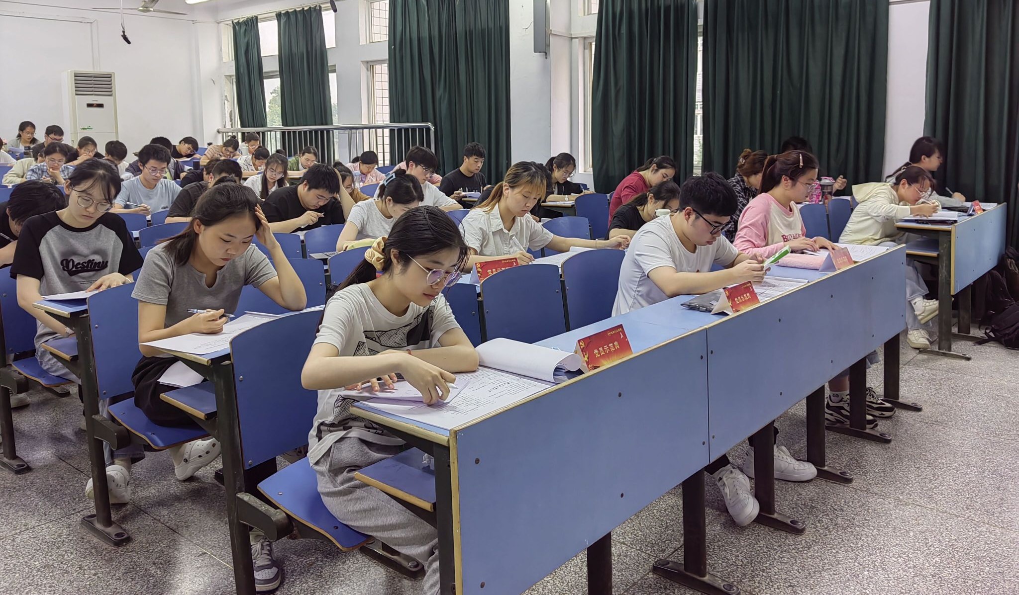 考试期间,全体学生党员“亮身份 做表率”,佩戴党员党徽参加考试,并将“党员示范岗”席卡放置在醒目位置,主动接受老师和同学们的监督。通过学生党员的示范引领,带动全院学子树立诚信考试意识,共同营造公平、公正的考试环境。