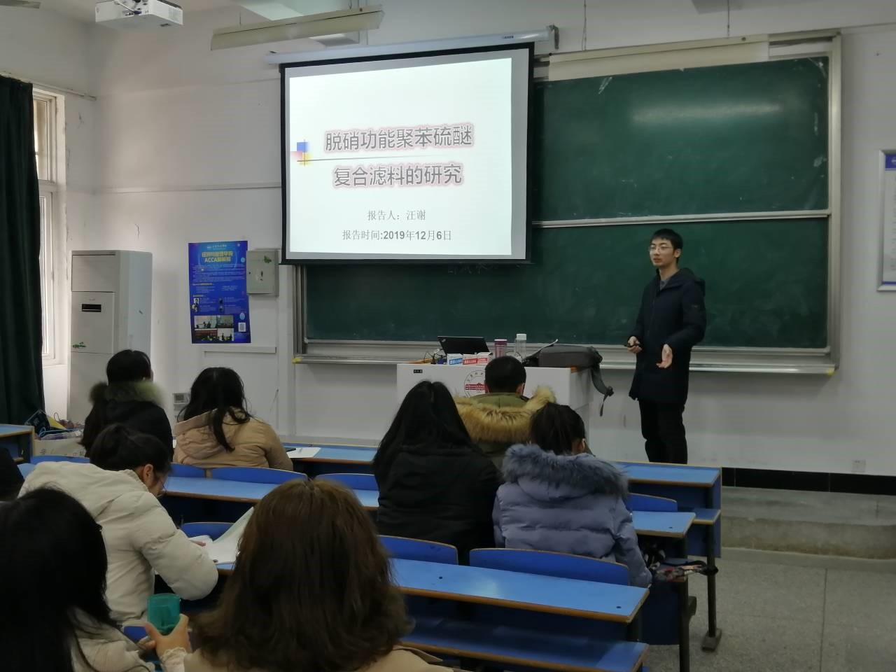 2019年12月6日上午10点,伟德victor1946青年教师汪谢博士在龙山校区教学楼C105教室作了一场题为“脱硝功能聚苯硫醚复合滤料的研究”的学术报告,学院材料化学专业部分教师及16、17级部分本科生参与了这次学术交流活动。