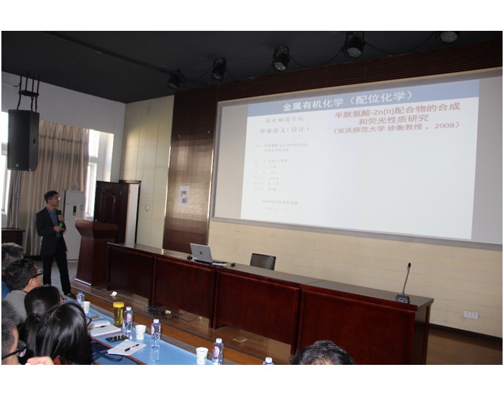 报告中朱从青教授将自己硕士以来围绕碳龙化学的新颖金属配合物的合成、反应及应用作了系统的报告,并将自己在我校学习以及成长经历为学弟学妹们进行分享,以激励他们更加努力的学习。朱教授的报告深入浅出,将自身的成功的科研经验向师生分享,引发了师生的广泛的兴趣,对提高学生的专业认知有着积极作用。