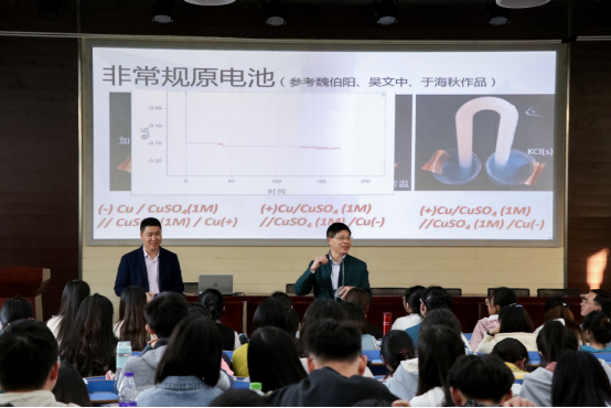 朱成东就学科知识、实验研究、信息技术、教学设计、课题研究等五个方面对新时代化学教师应当如何发展进行了详细分析,鼓励同学们打破常规,勇于思想创新。他建议化学专业师范生站在学科知识的更高角度上,透彻理解教材,准确把握实验,了解科学发展史,帮助学生更好地发展。紧接着,他从实验研究方面讲述了原电池中离子的移动,焰色反应,以及氢氧化亚铁的制备;从信息技术方面讲述了二氧化碳中混有氯化氢的除杂等问题。最后朱成东提出要将课题研究纳入课堂,善于从不同的知识中获取方式进行教学设计,结合广度、深度、联度层次进行多学科的交叉,对课题研究进行深入学习,从而带来更好的教学效果。