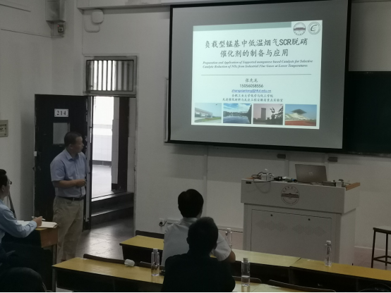 张先龙副教授作了以“烟气多种污染物超低排放的炭基催化剂及技术”为主题的报告。报告中张教授主要介绍了燃煤烟气脱硫脱硝及多种污染物一体化脱除和环境催化材料及催化新技术以及课题组最新研究成果。张教授报告内容丰富,拓宽了师生的视野和激发了学生的学习兴趣。