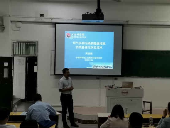 黄张根教授的报告题为“烟气多种污染物超低排放的炭基催化剂及技术”。黄教授在报告中讲解烟气污染物控制技术概况,烟气多种污染物脱除的炭基催化剂和炭基催化剂的移动床技术。黄教授的报告深入浅出,幽默风趣,黄教授还就研究生提出的相关问题给予了详细的解答。