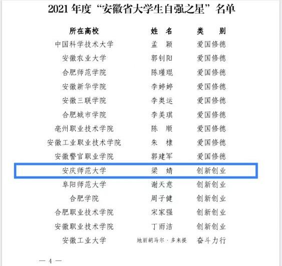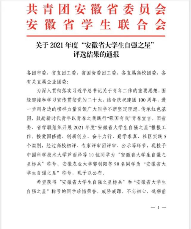 近日由安徽团省委、省学联组织开展的2021年度安徽省大学生自强之星评选活动落下帷幕,我院2019级材料化学(3)班梁婧同学荣获安徽省自强之星(创新创业)荣誉称号。