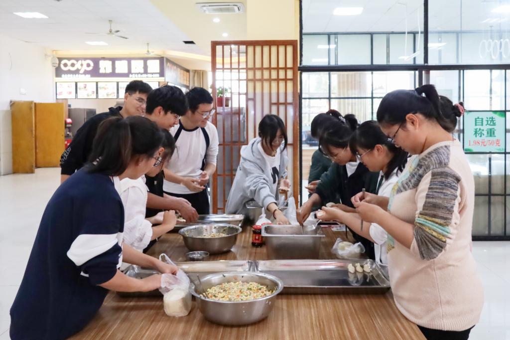 2斤白菜、10斤猪肉、1000张饺皮……一天前,副班长王裕带领班委成员一同去超市购买包饺子所需食材。下午3点,同学们与食堂工作人员一起将食材调配成馅料,开始着手包饺子。