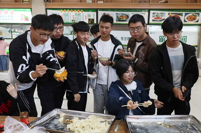 徐梦婷也是食堂包饺子“大军”中的一员。少放一点馅料,左手握拳伸出拇指与食指,右手将饺子内外侧的皮捏出褶皱,跟着食堂阿姨的教学,徐梦婷从手法生疏到能独立包出一只好看“月亮饺”,得到食堂阿姨的“真传”。