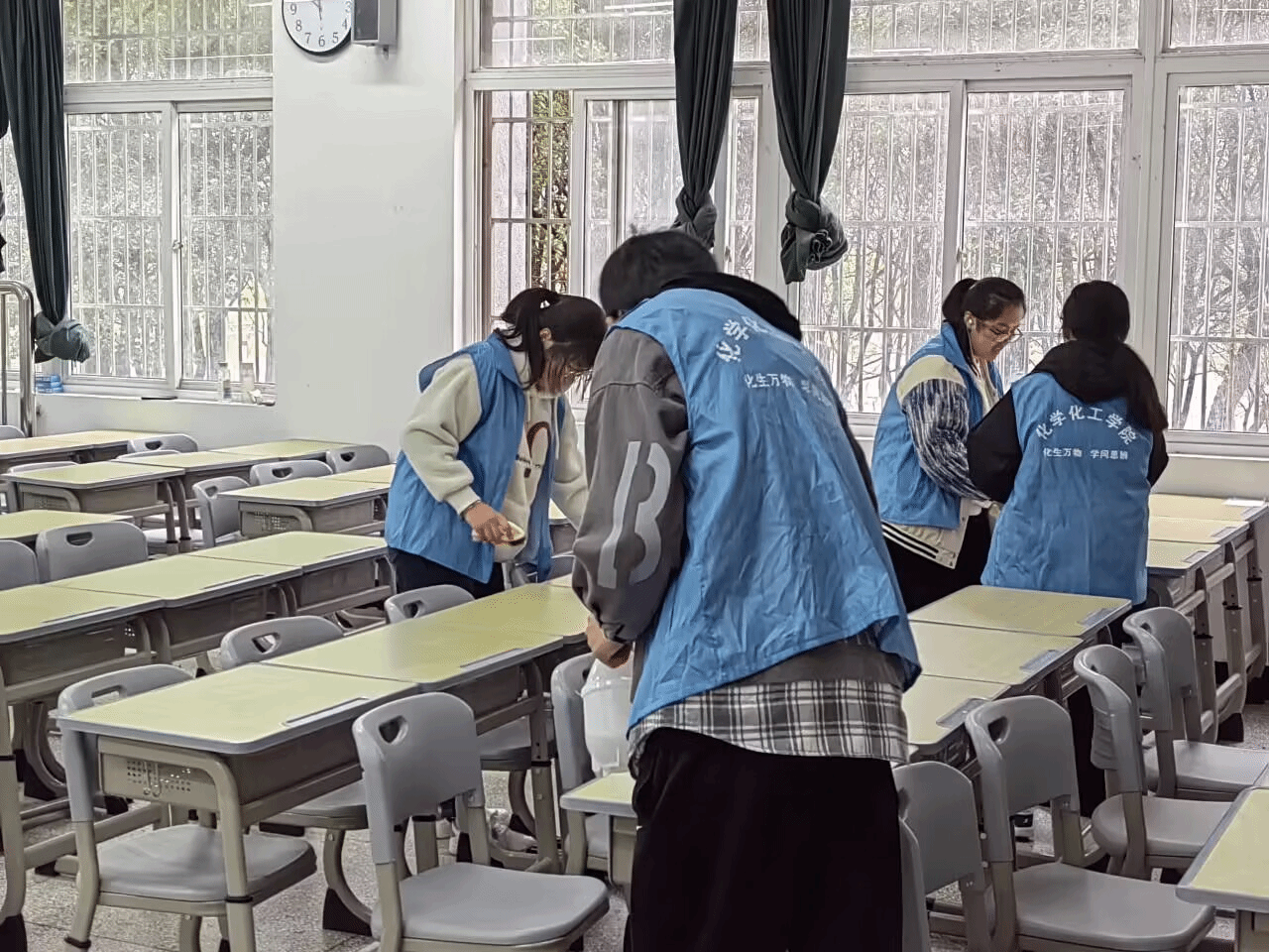 同学们提前邀请专业课老师作为技术指导,利用极性相似相溶原理,专门针对桌面的笔记等污渍,配制合适浓度的清洁剂。经过多次配方调整和实地试验,终于调配出适宜浓度、清洁效果最佳的“秘密武器”。活动当天同学们携带自制的清洁剂和工具前往责任教室,清扫活动正式开始。活动现场热火朝天,同学们积极参与,充分发扬“不怕苦、不怕脏、不怕累”的精神,大家分工明确、互帮互助、干劲十足。在大家的通力协作下,教室课桌的笔迹顽渍逐步被清除。