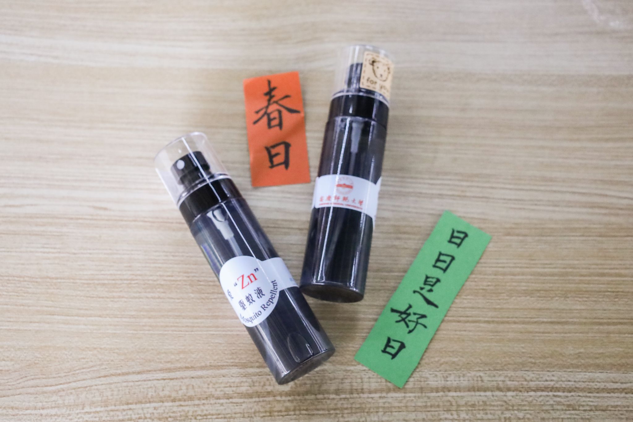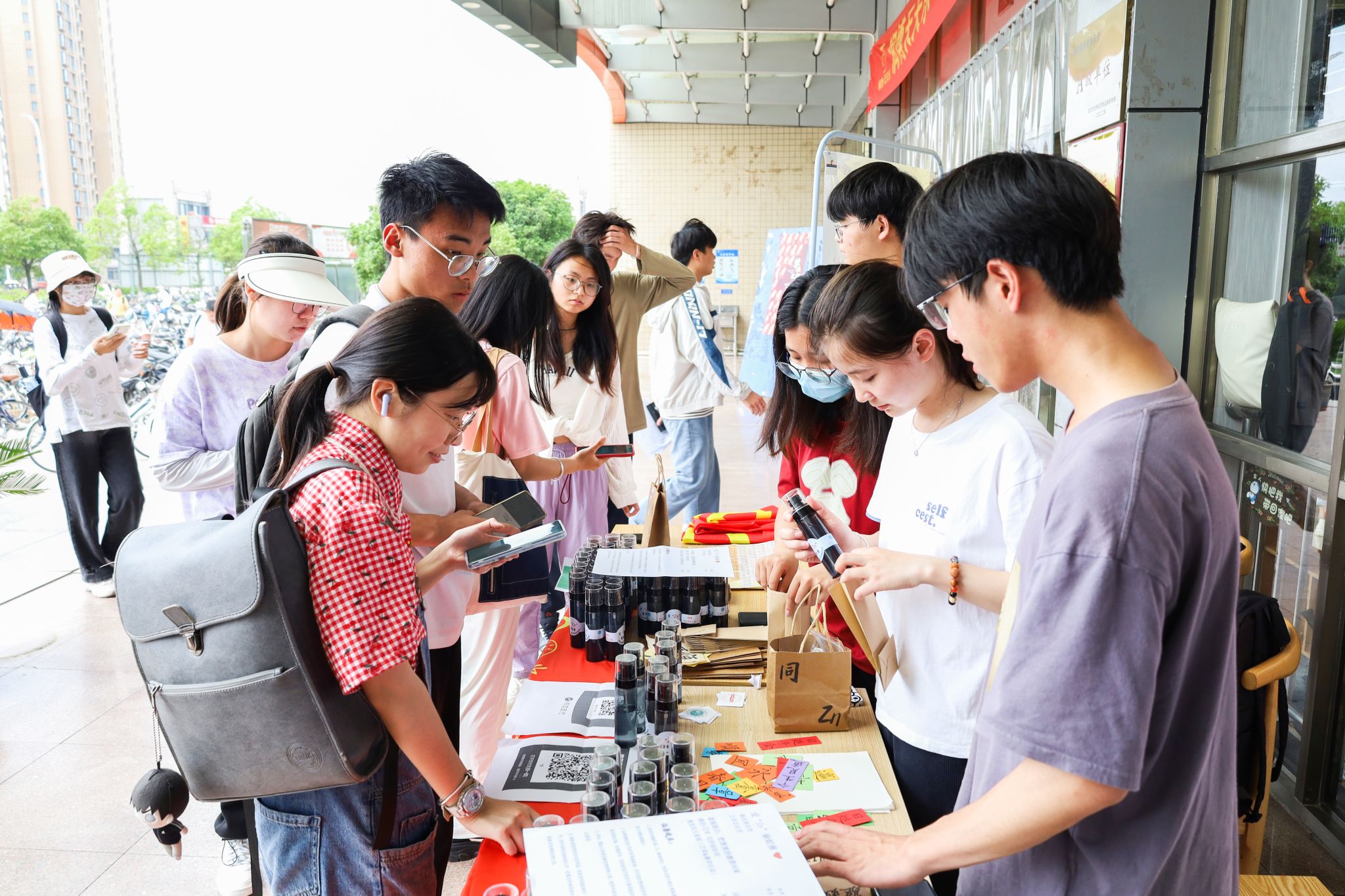 手工制品在摊位上摆放整齐,印有书法字样的牛皮纸包装吸引了来往师生的注意。学校东、西苑食堂门口,活动负责人、化学工程与工艺专业2022(1)班的班长黄顺向学生们介绍驱蚊液的成分和效果。贴上院徽标签、赠送祝福贴纸,每一份手工产品还配有由学院学生自制的书法小卡片,寄托着学生们对助力公益者的美好祝愿。