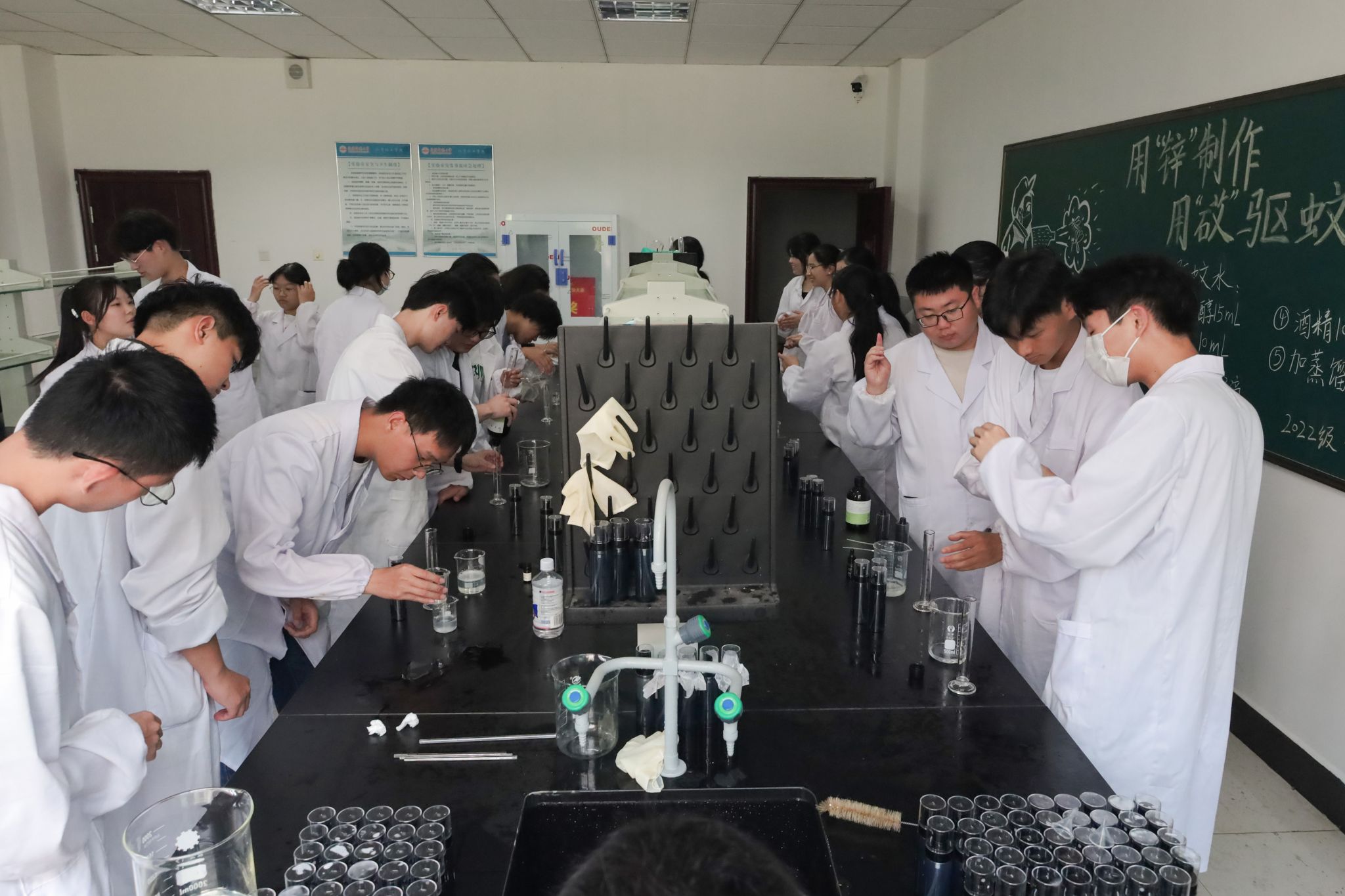 依次倒入柠檬桉醇和纯露,滴入精油提香,最后加入酒精和蒸馏水搅拌装瓶,一瓶手工制作的驱蚊液诞生在学生手中。“我们按步骤添加制作,整个流程简单且有趣!”化学工程与工艺专业2022(1)班的李心怡在驱蚊液中加入了薰衣草精油,试用过程中有不少学生“循香而来”。在她看来,自己将理论作用到实践中,巩固专业知识的同时也收获了劳动的乐趣。