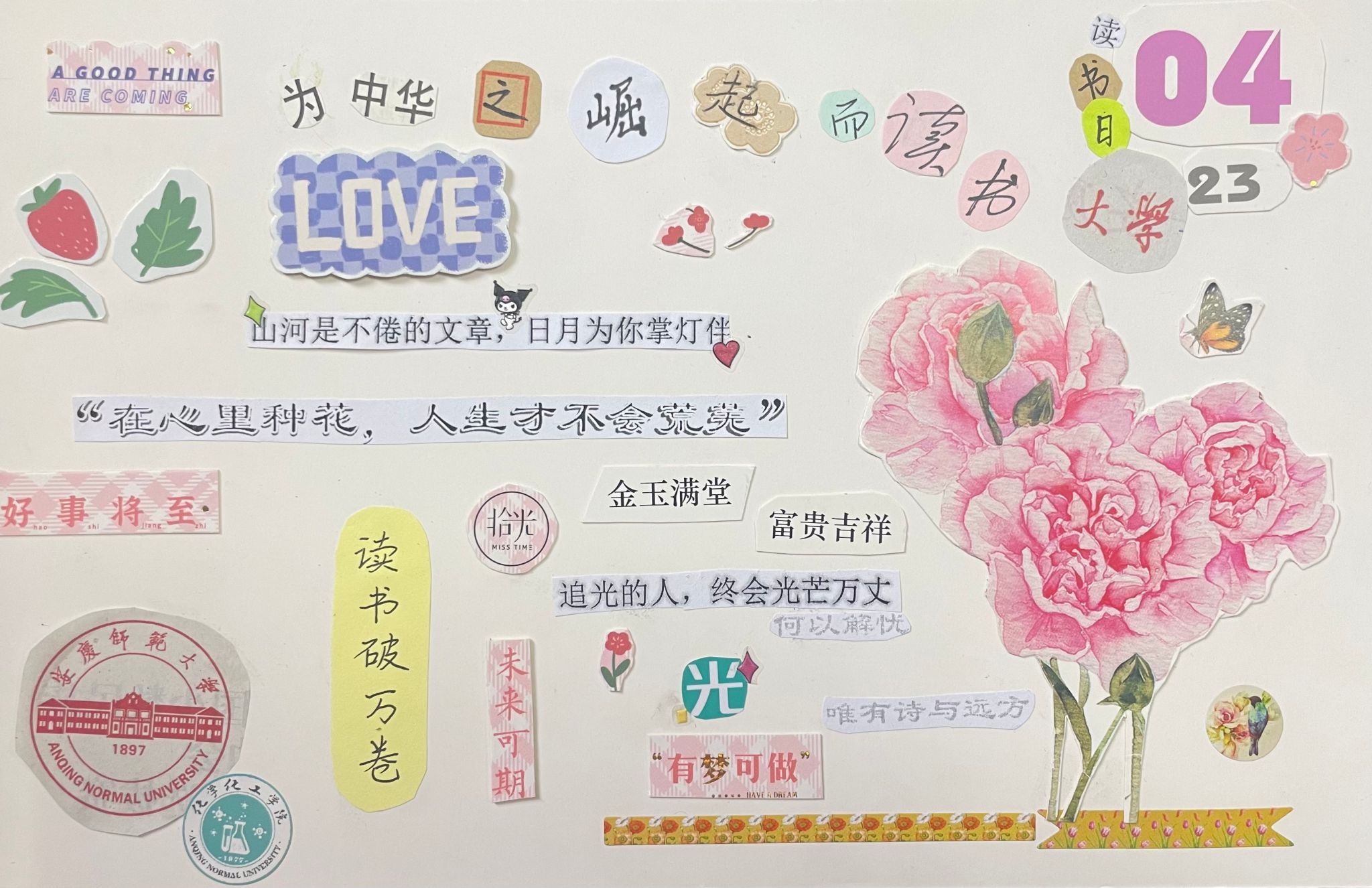 “不管世事如何沧桑变幻,不论生活会有多少苦难,我都应该学会微笑向暖,纵有惊涛,心亦安然。”2023级化学专业(4)班施文晴分享到,“第一眼我就选中了这个素材,在拼接过程中我也体会到文字魅力。正如习近平总书记所说,‘中华文化源远流长、博大精深,如同一座宝藏,一旦探秘其中,就会终生受用。’在未来的日子里,我会继续坚持阅读和创作,让文字成为我生活的一部分。”