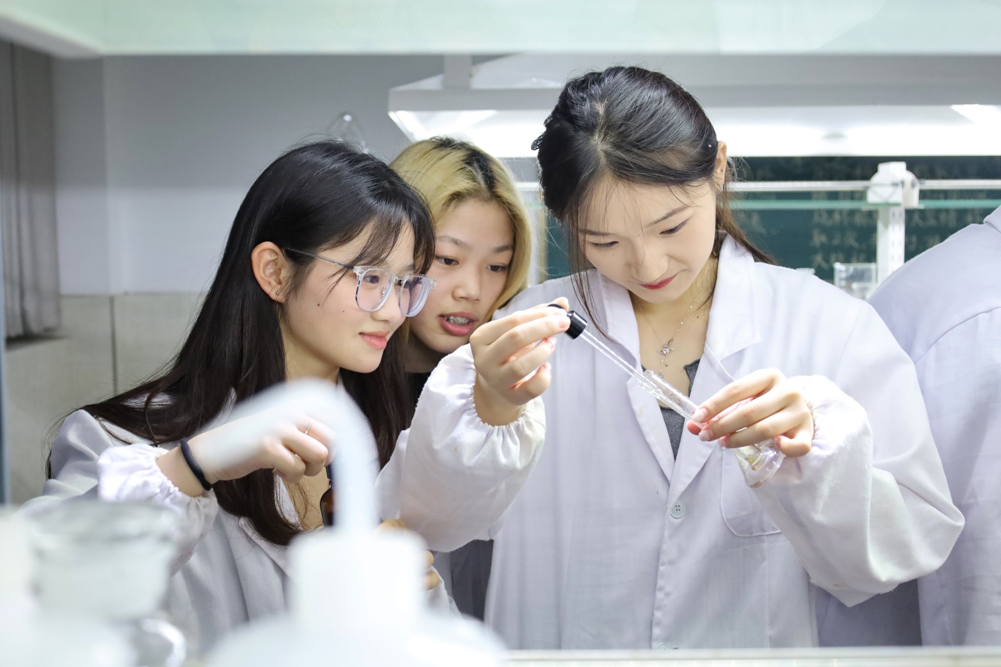 准备道具、称取白蜡、加热搅拌……黑板上,每一个实验步骤都写得清晰明了。学生们站在实验台前,手持玻璃棒,反复搅拌着烧杯中的白蜡。“请大家注意,需要将蜡搅拌至完全透明,才能进行下一步操作。” 化学工程与工艺专业2022(1)班的汪宏亮化身讲解员,提醒学生们要注意实验中可能出现的问题。