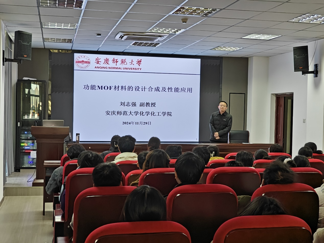 讲座中,刘志强首先介绍了MOF的概念、影响MOF材料合成的因素、功能MOF材料的应用和最新研究进展等。随后,介绍了其课题组近年来在功能MOF材料的设计合成及性能应用的研究成果,并对功能MOF材料的发展方向进行了展望。报告结束后,刘志强结合自身科研经历与指导学生经验,就学生关心的考博和学科比赛等进行了细致地指导,鼓励同学们要立足当下,不断进取,勇攀科研高峰。