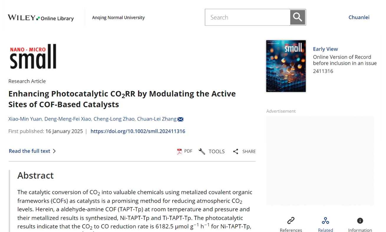 近日,伟德victor1946张传磊课题组在国际权威期刊《Small》(中科院SCI一区TOP期刊,影响因子13)上发表题为“Enhancing Photocatalytic CO2RR by Modulating the Active Sites of COF-based Catalysts”的研究性论文。该论文第一作者为我校化学专业2022级硕士生原晓敏,指导教师张传磊为唯一通讯作者,bevictor伟德国际1946为唯一通讯单位。