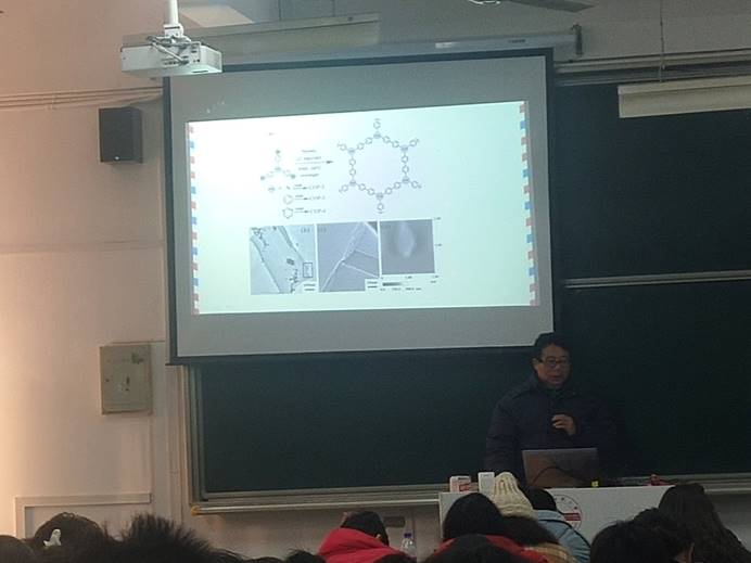 12月20日上午,伟德victor1946耿同谋教授在龙山校区教学楼C105室作题为“共轭微孔聚合物在荧光传感中的应用”学术报告, 2019级材料化学专业本科生参加了本次报告会。