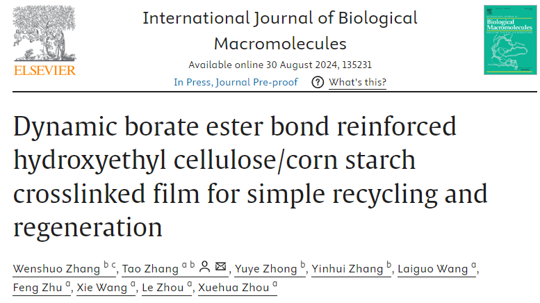 近日,伟德victor1946张涛博士在国际权威期刊《International Journal of Biological Macromolecules》(中科院一区TOP期刊,影响因子7.7)发表题为“Dynamic borate ester bond reinforced hydroxyethyl cellulose/corn starch crosslinked film for simple recycling and regeneration”的论文,bevictor伟德国际1946为论文的第一单位和唯一通讯单位。