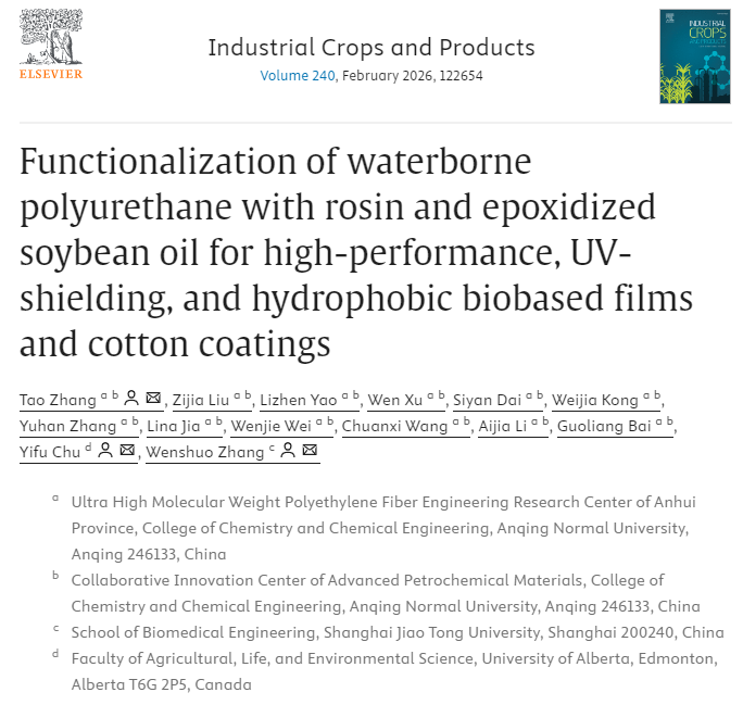近日,伟德victor1946张涛博士在国际权威农林科学期刊《Industrial Crops and Products》(中科院农林科学大类1区TOP,影响因子IF=6.2)在线发表题为“Functionalization of waterborne polyurethane with rosin and epoxidized soybean oil for high-performance, UV-shielding, and hydrophobic biobased films and cotton coatings”的研究论文。bevictor伟德国际1946为该论文第一单位和通讯作者单位,加拿大阿尔伯塔大学和上海交通大学为共同通讯作者单位。