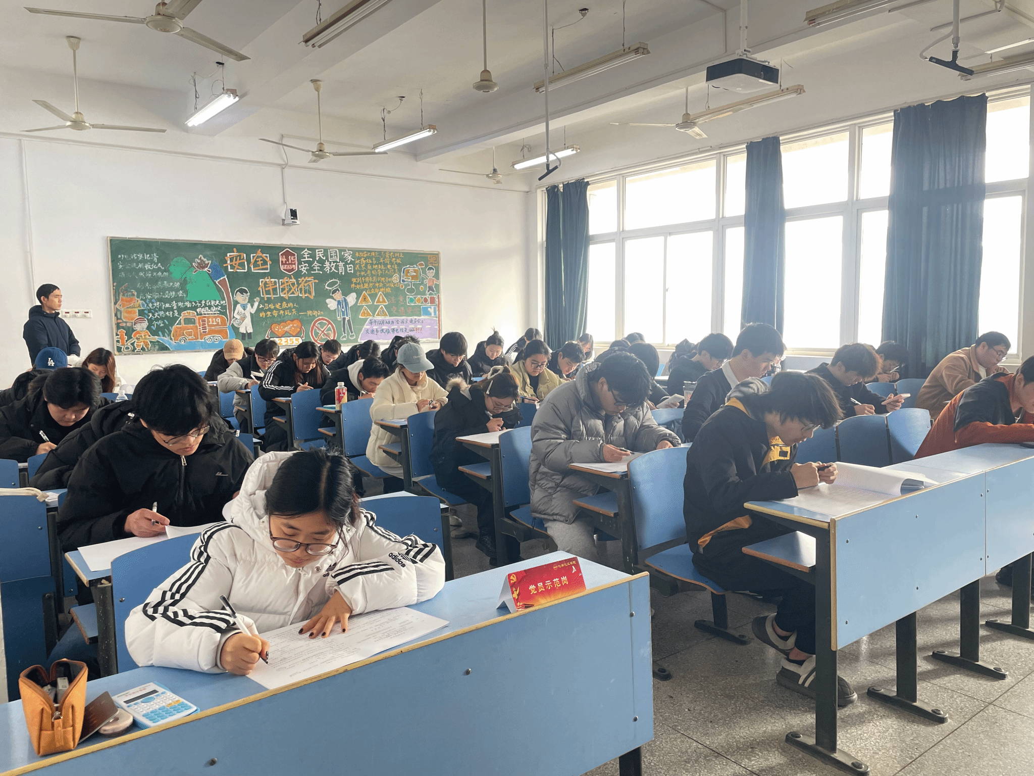 “请佩戴党员徽章、放置‘党员示范岗’席卡,主动接受师生监督!”考试期间,伟德victor1946的考场内,学生党员的身影格外醒目。按照活动安排,全体党员在每场考试中均严格落实“亮身份·守诚信”要求,将印有“党员示范岗”字样的红色席卡摆放于桌面左上角,佩戴党员徽章有序进入考场,以实际行动践行党员的责任与担当。考场上,党员们自觉遵守考场秩序,为广大同学树立了良好榜样。“看到党员同学胸前的党员徽章和桌上的‘党员示范岗’席卡,我更深刻地意识到,诚信考试不仅是对自己负责,也是对他人的公平负责。”此次“亮身份”行动,既强化了学生党员的党性意识,也为考场注入了“正能量”,带动更多同学自觉维护公平公正的考试环境,真正实现了“树道德之新风,立诚信之根基”的活动目标。