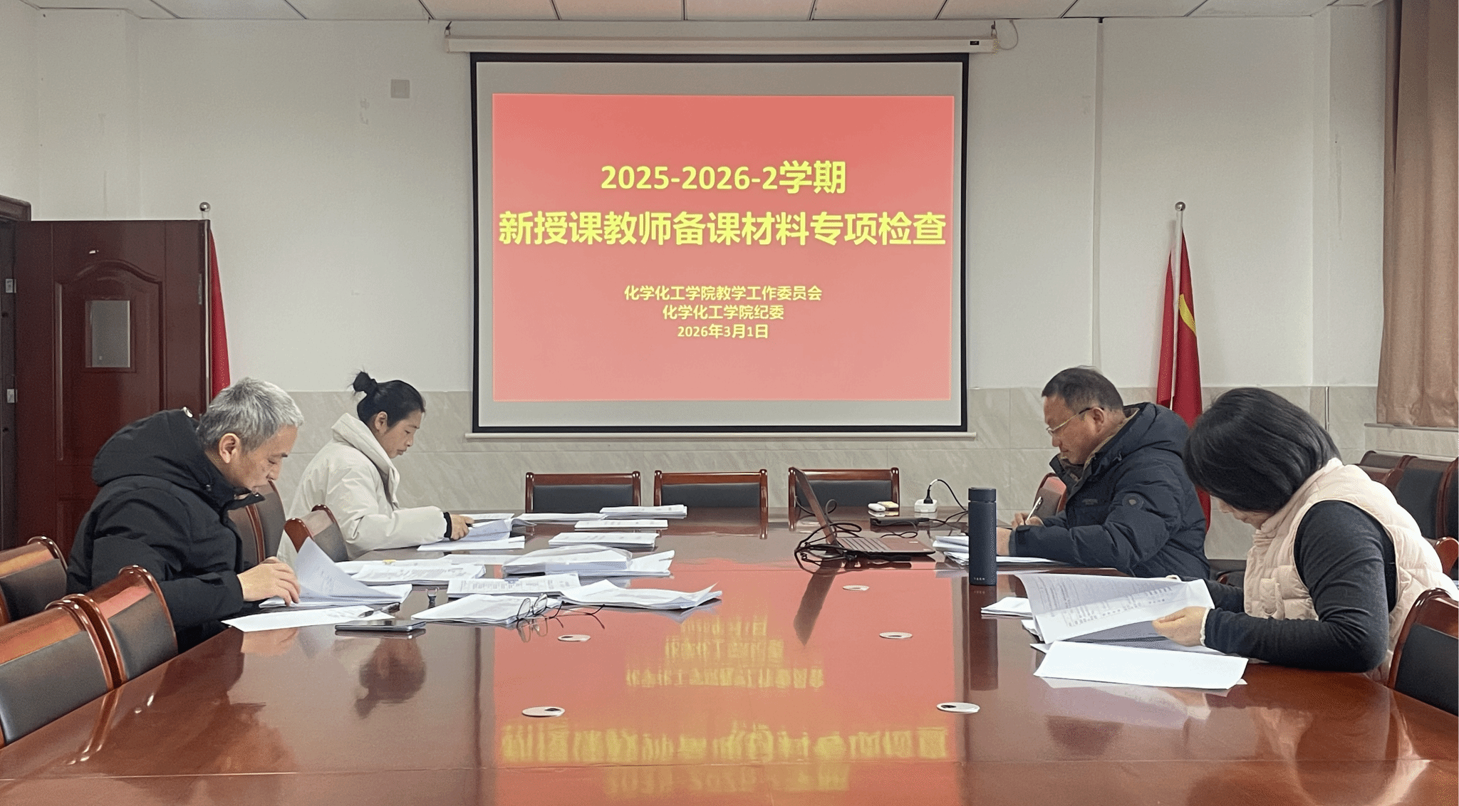 3月1日下午,伟德victor1946组织开展 2025-2026-2 学期新授课教师备课材料专项检查。本次检查组由学院纪委、教学工作委员会和督导组联合组建,以“五有”教学材料为重点,对 15 位新授课教师承担的 25 门课程进行全面细致的质量核验,为学院教学质量提升与教师队伍建设筑牢基础保障。