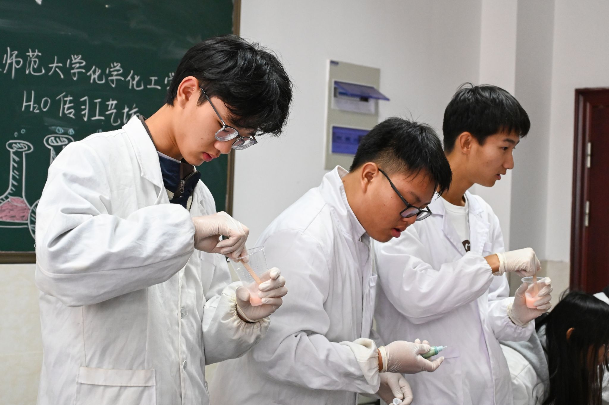 称取AB胶、加入色素、充分搅拌……实验步骤被条理清晰地罗列在黑板上。“A胶与B胶的克重必须保持一致。”活动正式开始前,化学工程与工艺专业2023(2)班的廖芸颉作为讲解员,向参加此次活动的学生们详细介绍了制作捏捏乐所需的材料及注意事项。小老师们在实验室的各个角落穿梭,随时为需要帮助的学生提供指导。“看到他们从起初的迷茫无措到掌握技巧后的自信从容,我觉得自己的付出是有意义的。”廖芸颉坦言。