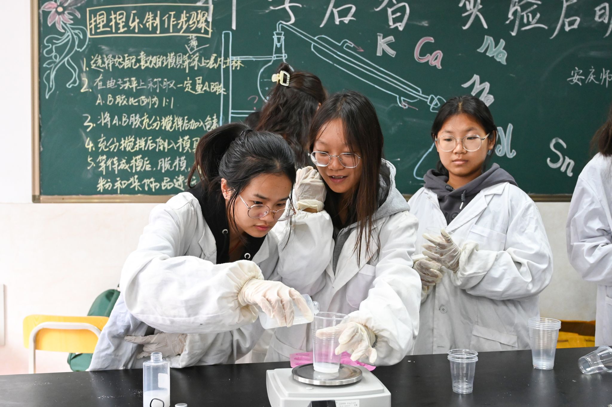 学生们两人为一组,身着白色实验服,手戴一次性乳胶手套。他们在电子天平上根据模具的大小称取A、B胶各15~20克,滴入自己喜欢的颜料后,使用搅拌棒将其进行搅拌融合,最后将混合物倒入已事先在其内部均匀涂抹了凡士林的模具中。